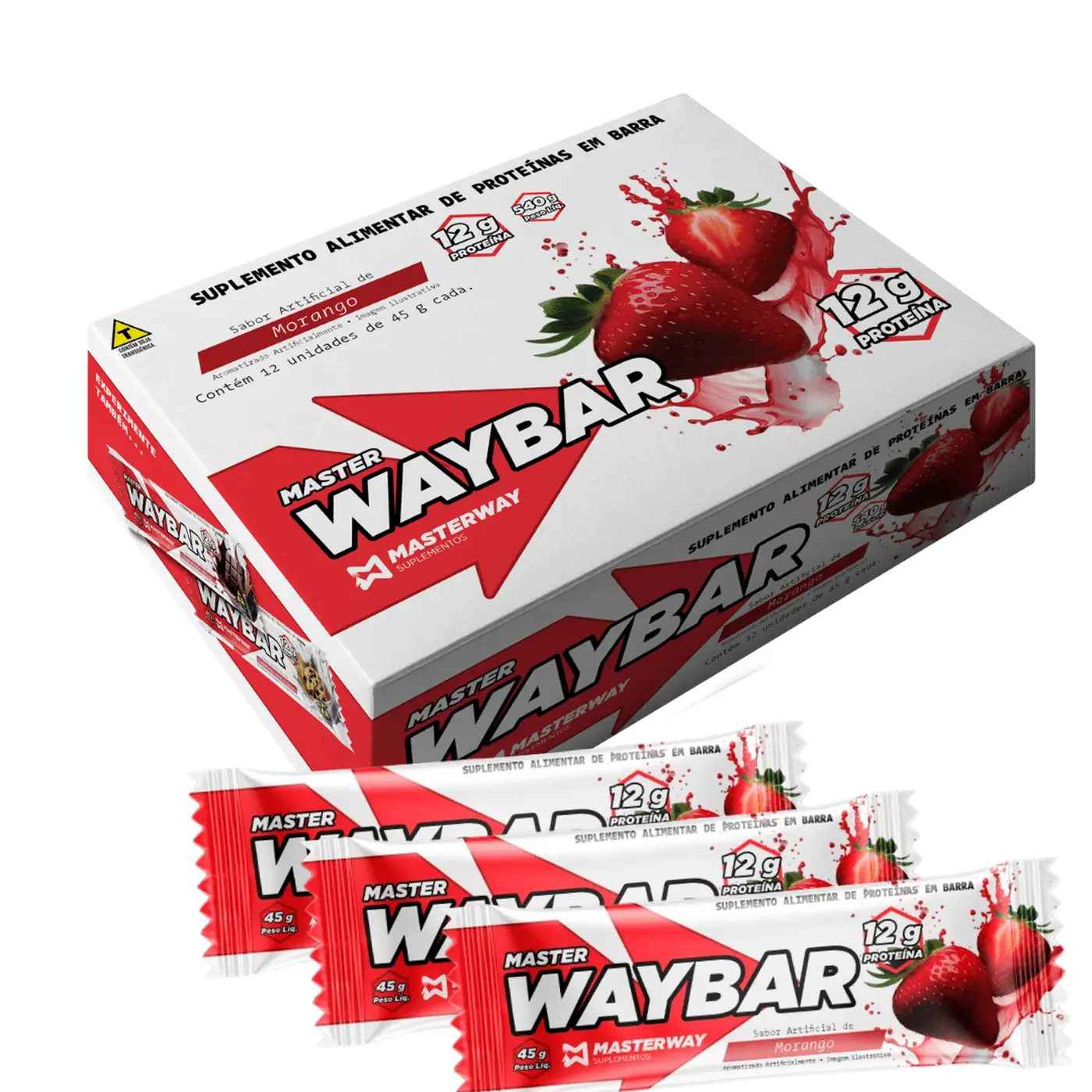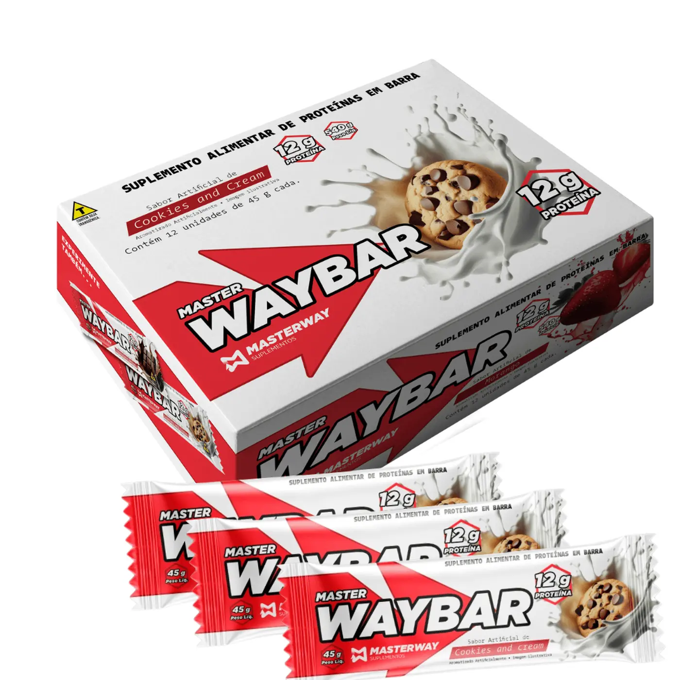 - Barrinha de Proteína Masterway (45 g) — 12 g de proteína por unidade, sabores Chocolate Belga, Morango e Cookies & Cream. Prática, gostosa e pronta pra qualquer correria.