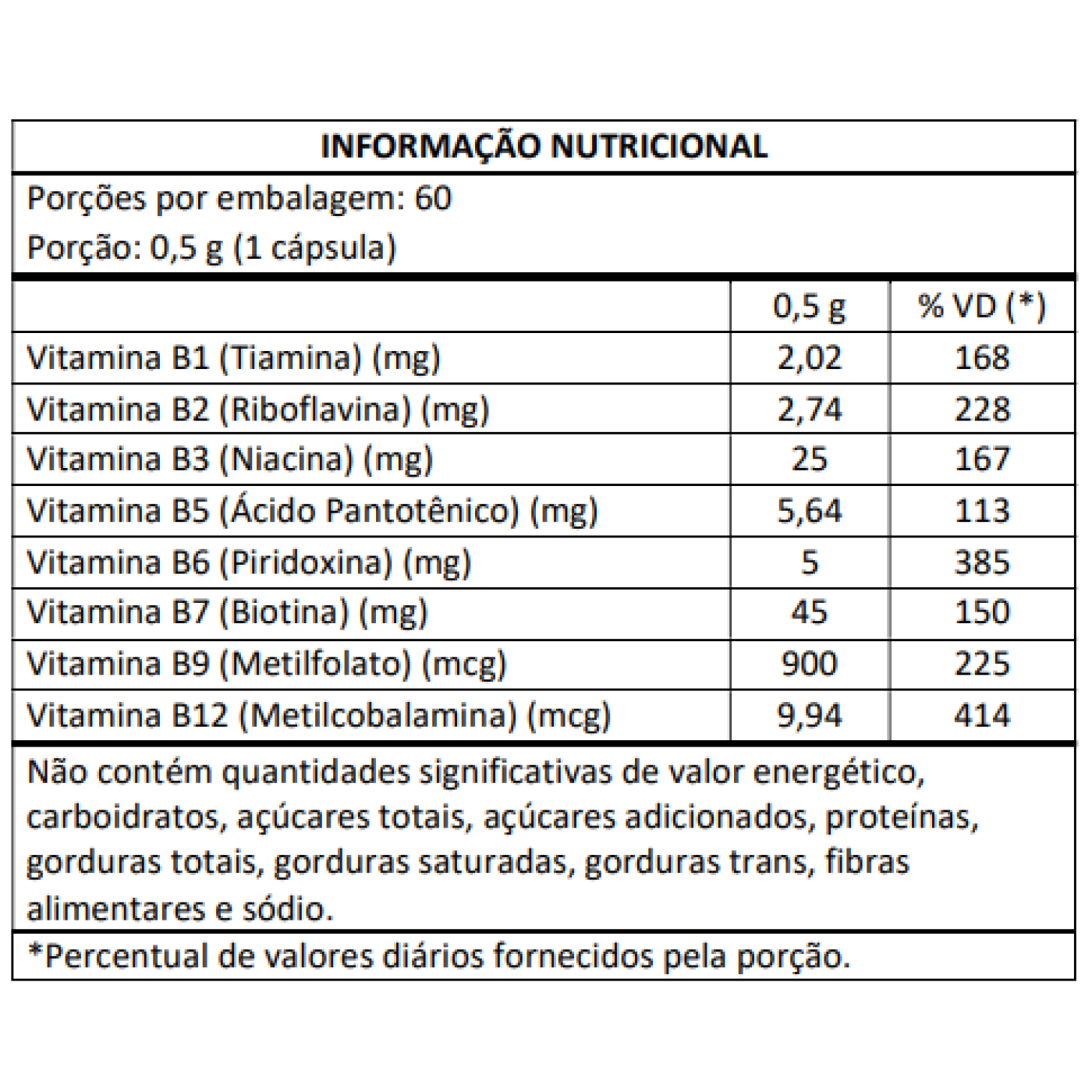 - Suplemento alimentar em cápsulas que reúne todas as vitaminas do complexo B. Destaque para B9 na forma Metilfolato e B12 na forma Metilcobalamina (formas ativas). Frasco com 60 cápsulas de 500 mg.